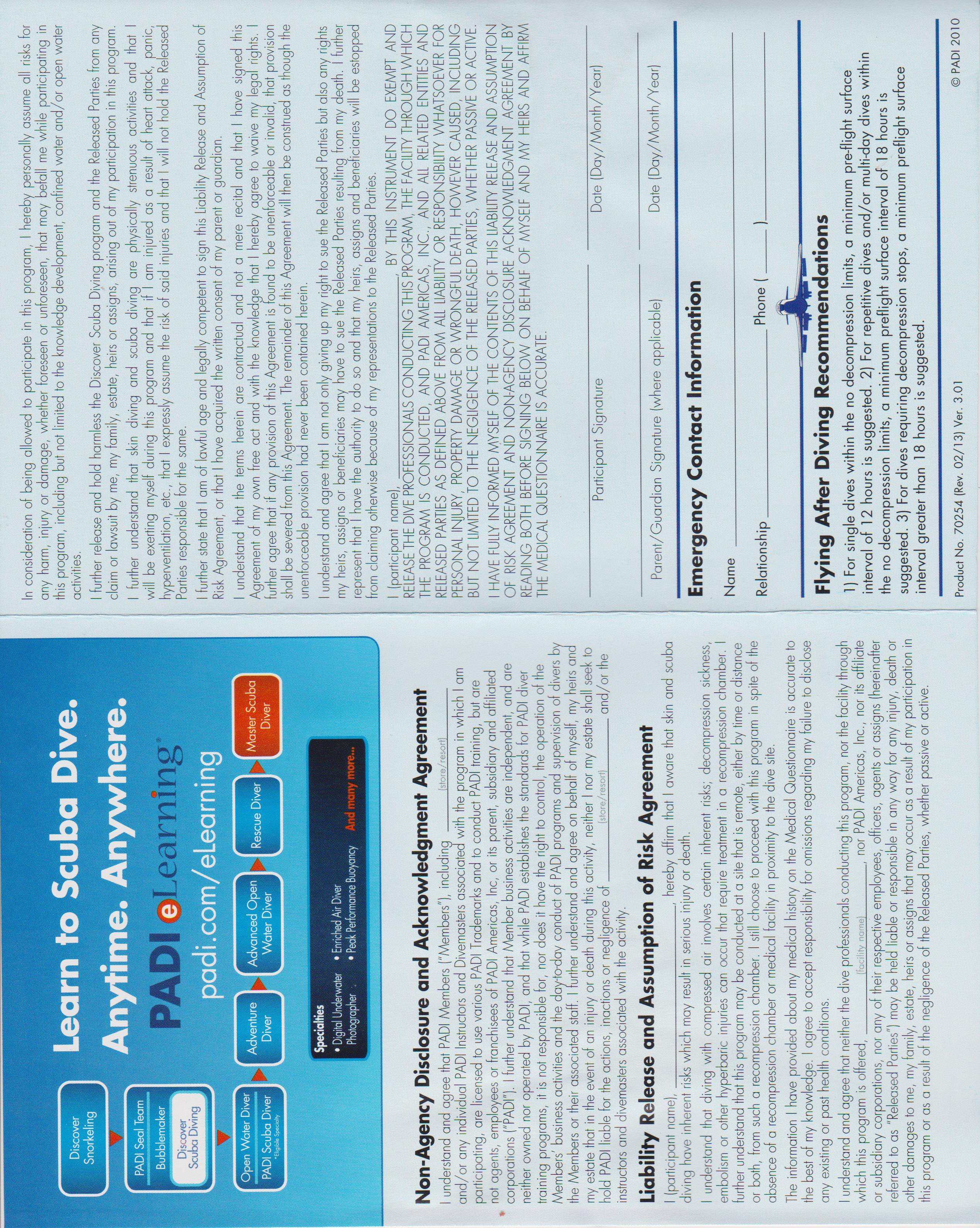 PADI DSD Waiver-Parental Consent form-Must Sign!